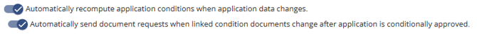 Enabling ‘Automatically send document requests when linked condition documents change after application is conditionally approved’ enables automatic document requests in conjunction with automatic conditions.
