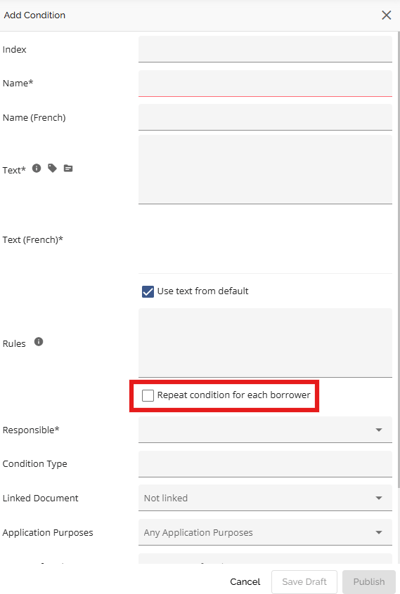 Conditions can be set to “repeat” meaning they can be applied to multiple stakeholders but only applies to objects that are directly tied to stakeholders. For example, if a condition is set to repeat for the income type “Pension,” the system will generate a separate condition for each stakeholder who has Pension income. If you want a rule to repeat you need to check the ‘Repeat Condition for Each Borrower Checkbox when configuring your condition:
