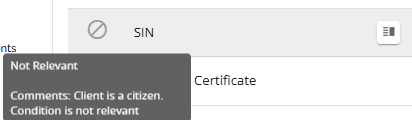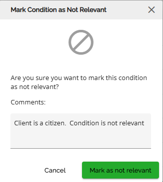 The icon for the marked condition will change to a circle with a line through it which indicates it has been marked as Not Relevant. Hovering over the icon will display a tool tip showing you what the icon means.