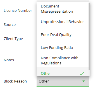 Users with access to Broker Management are able to change the block reason if necessary. To do so, they would simply open up the drop down menu in the Block Reason section of Broker Details -> Overview tab and select another option from the list.