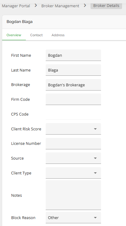 - The Overview tab displays general details about the selected broker, including First Name, Last Name, Brokerage, Firm Code, Client Risk Score, Source, Client Type, and Notes. Except for the Firm Code, all information in this tab is editable. Any changes made are automatically saved.