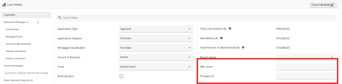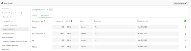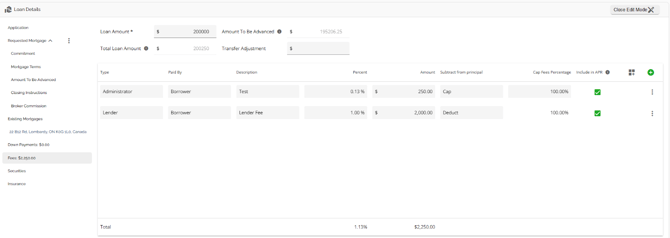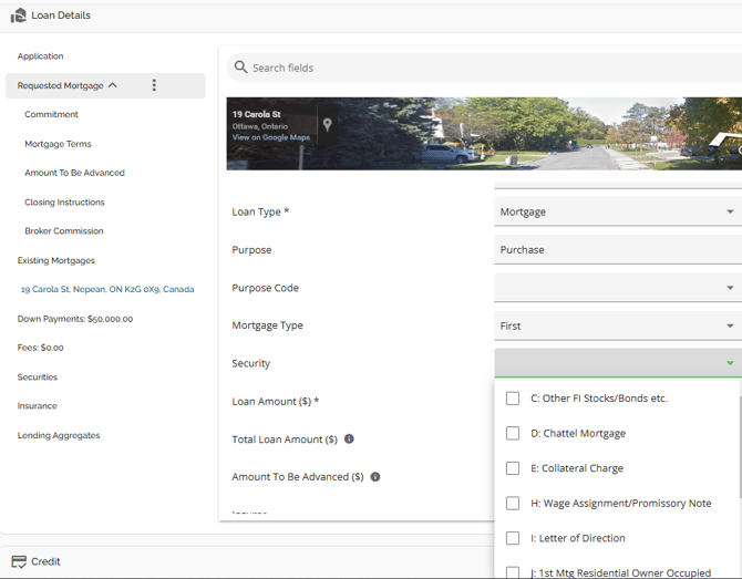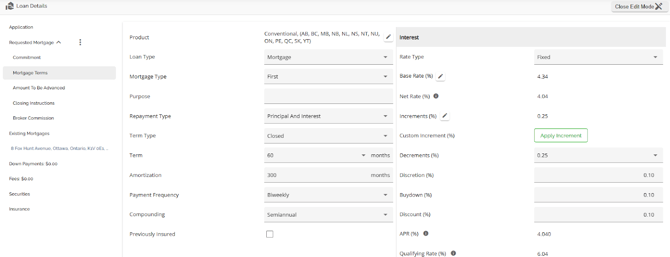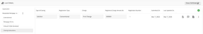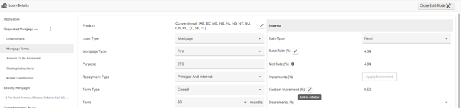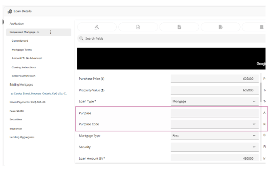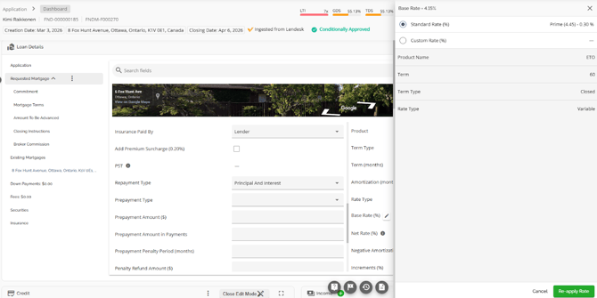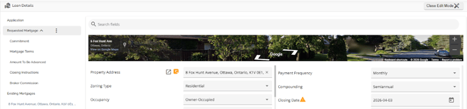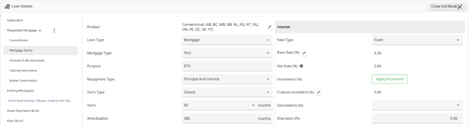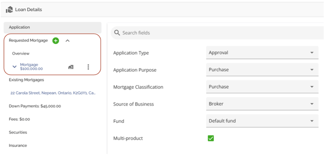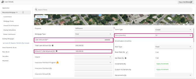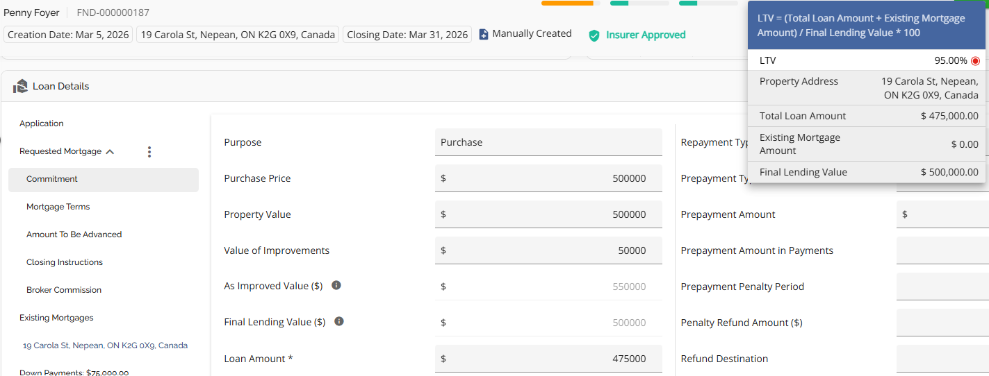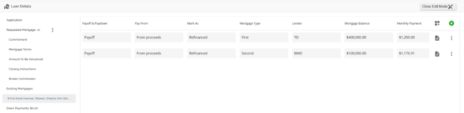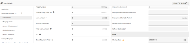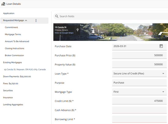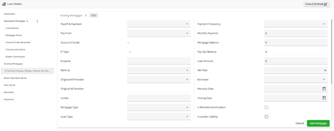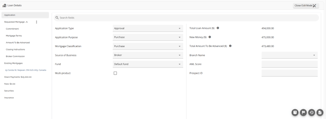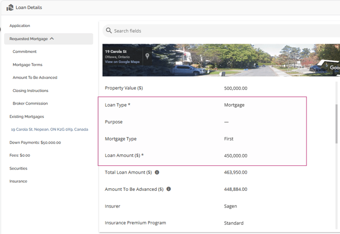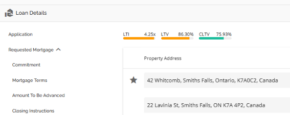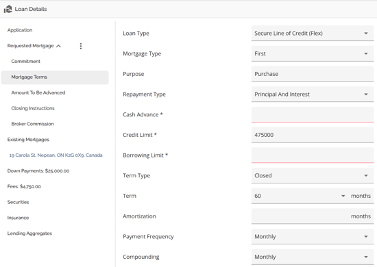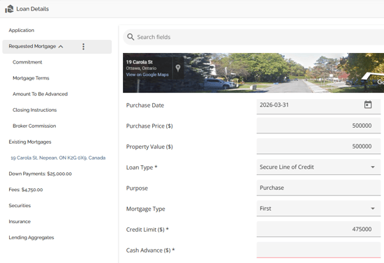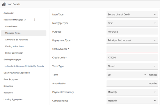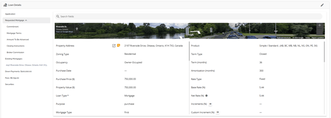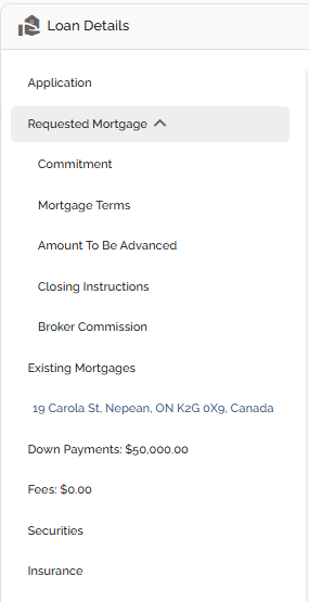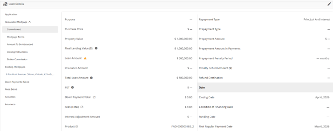 The Loan Details widget is a central source for all critical information related to the subject mortgage. It efficiently gathers and displays essential data, including the requested mortgage specifics, associated terms (mortgage and commitment), closing instructions, broker commissions, existing mortgages, down payments, fees, securities, insurance, and, where applicable, lending aggregates.