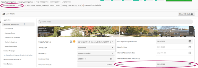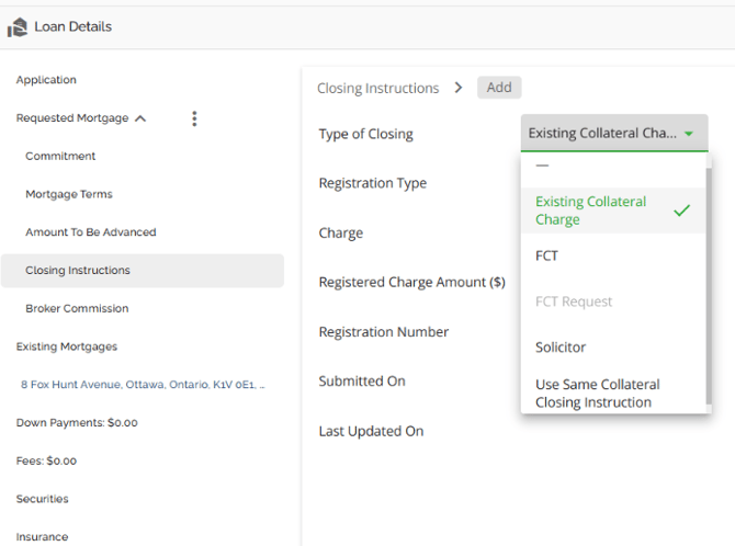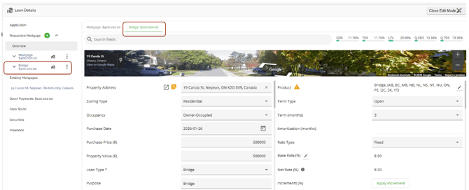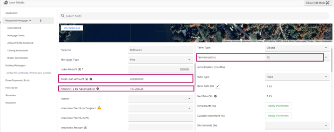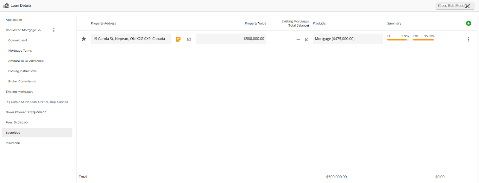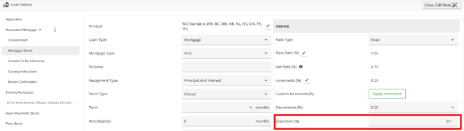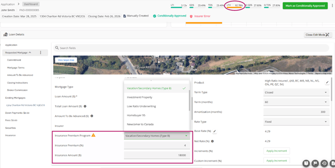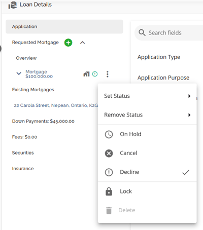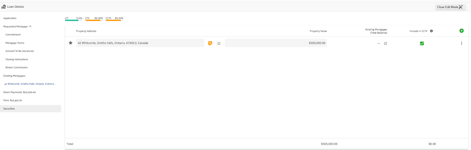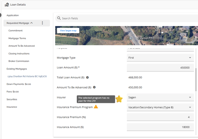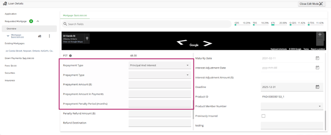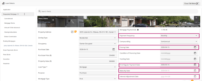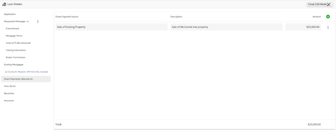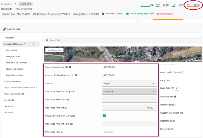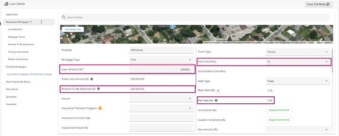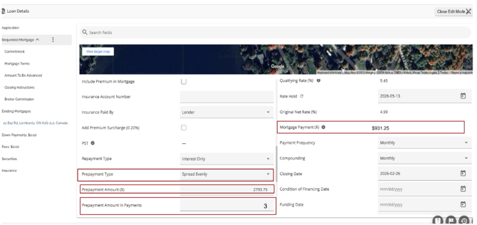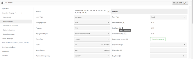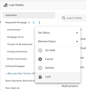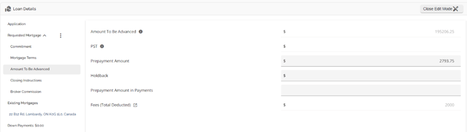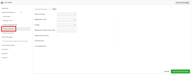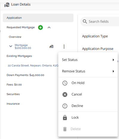The Loan Details widget is a central source for all critical information related to the subject mortgage. It efficiently gathers and displays essential data, including the requested mortgage specifics, associated terms (mortgage and commitment), closing instructions, broker commissions, existing mortgages, down payments, fees, securities, insurance, and, where applicable, lending aggregates.