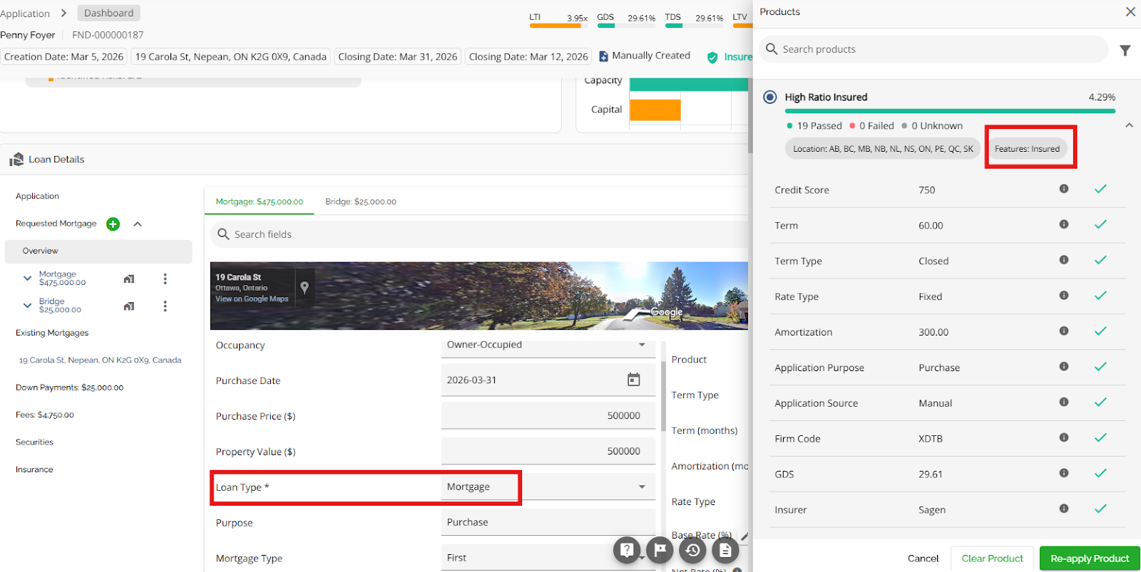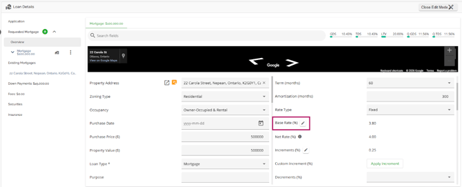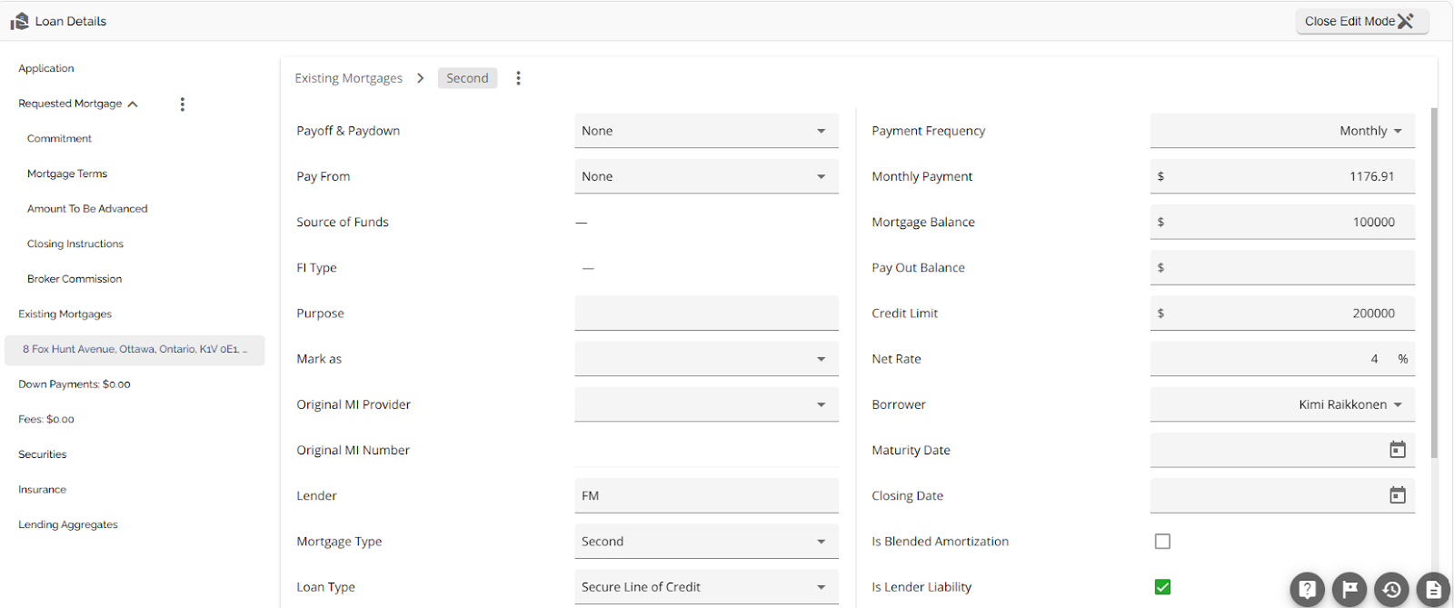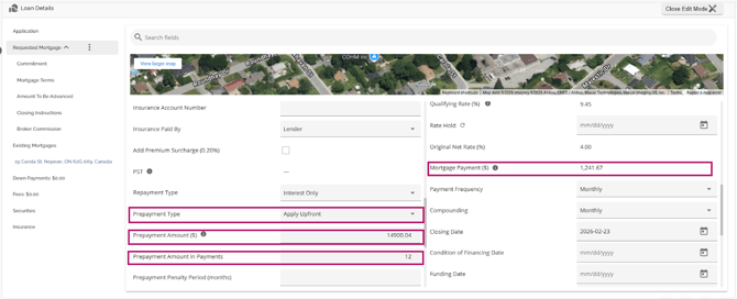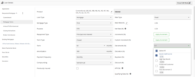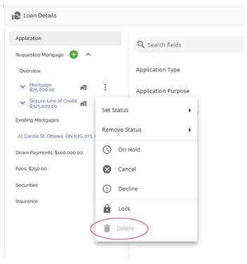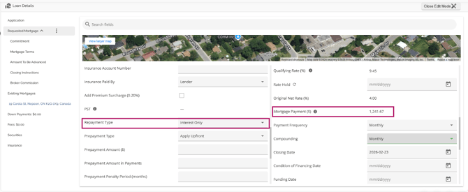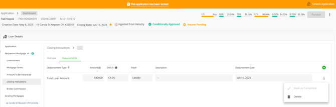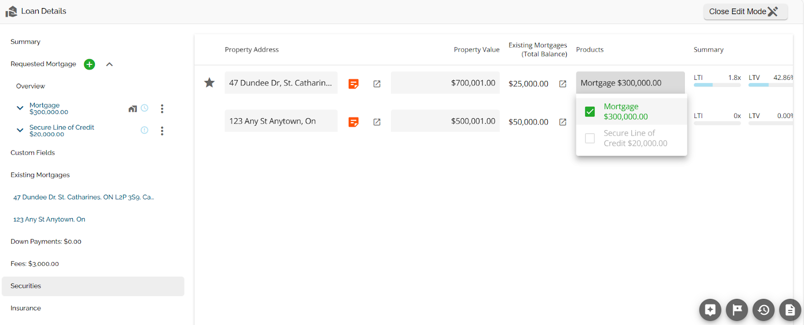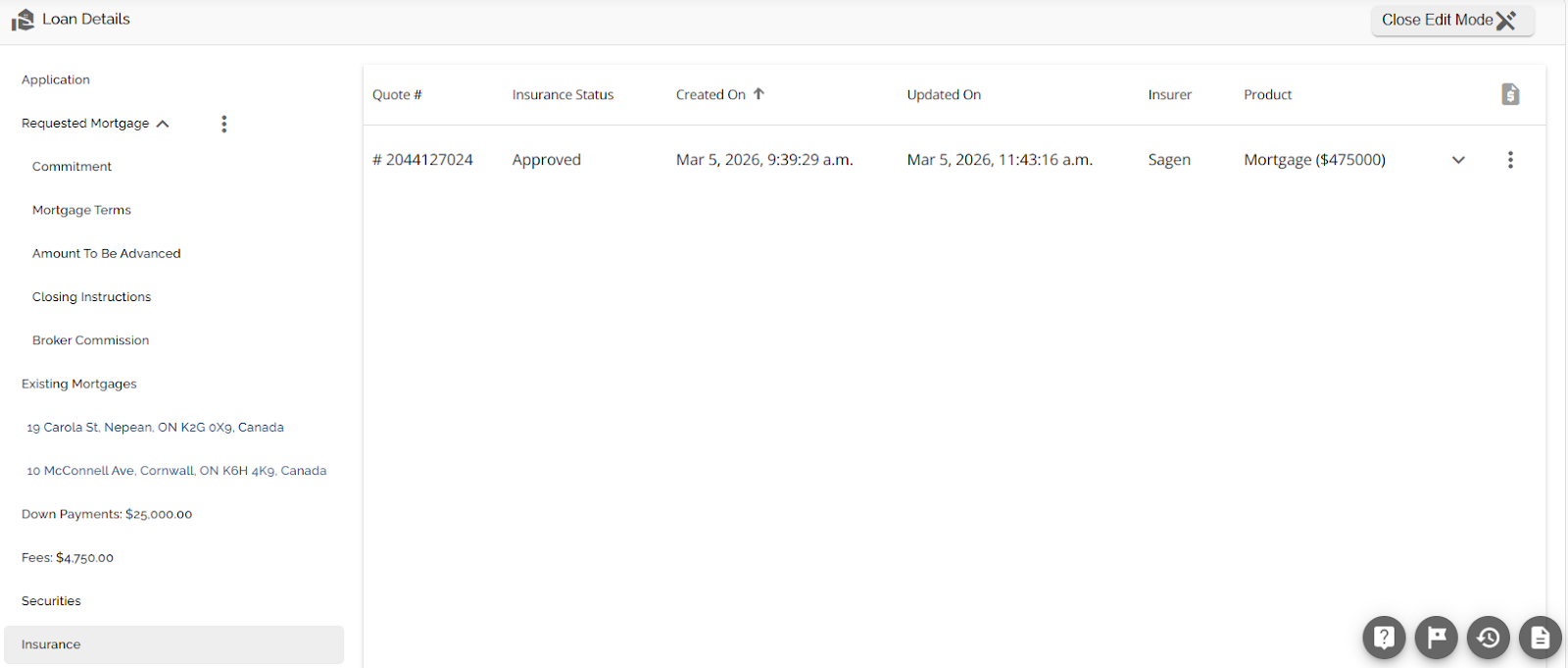 The Loan Details widget is a central source for all critical information related to the subject mortgage. It efficiently gathers and displays essential data, including the requested mortgage specifics, associated terms (mortgage and commitment), closing instructions, broker commissions, existing mortgages, down payments, fees, securities, insurance, and, where applicable, lending aggregates.