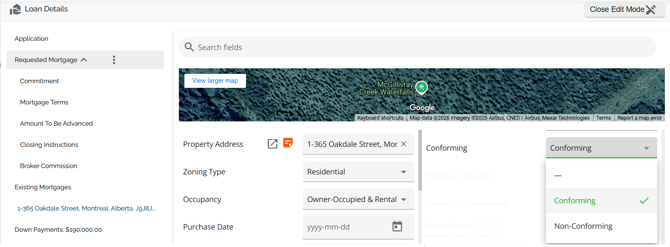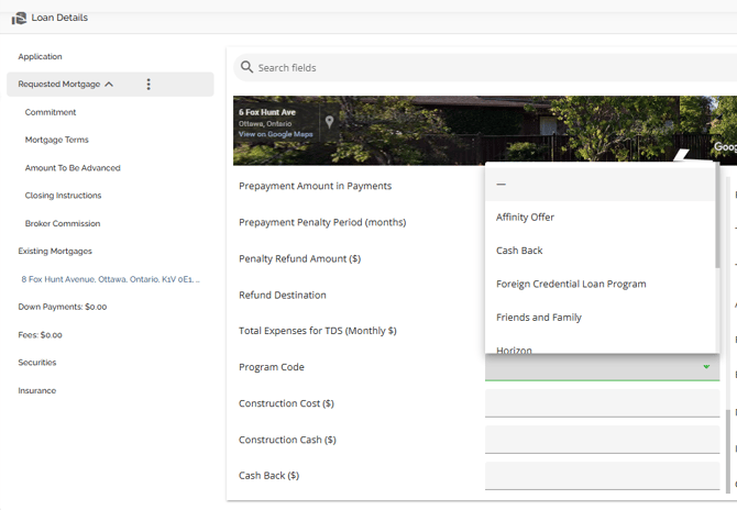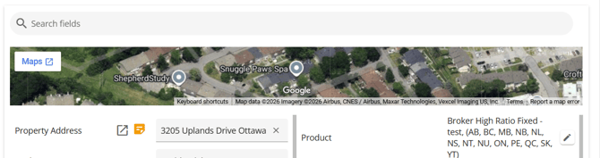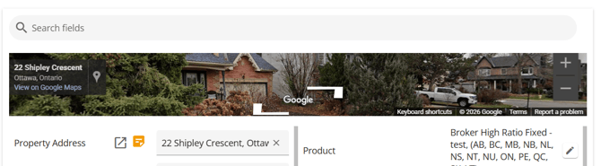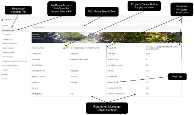 Requested Mortgage Field Name Search Box - This is located above the Google map section. In the search box, you are able to enter text/keywords related to the name of the fields. All fields containing the search criteria will be highlighted in the details section.