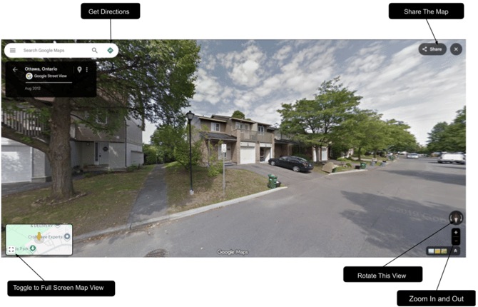 The Google Maps feature offers a variety of options for users to utilize. These options include toggling to full screen, dragging and dropping to move around the map, rotating the view, zooming in and out, moving forward and backward, and viewing other Google Maps options.