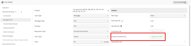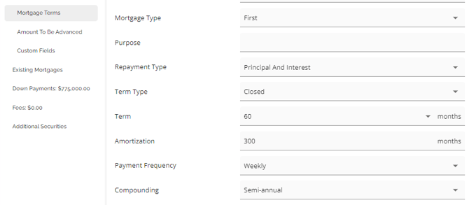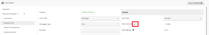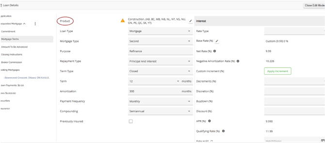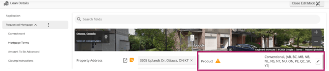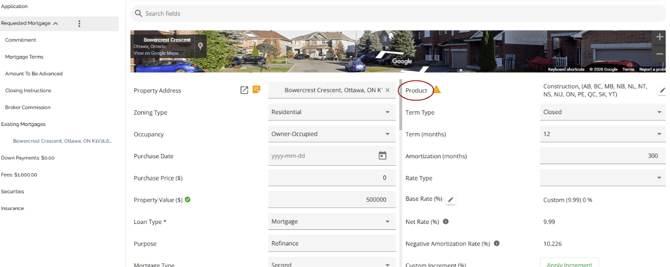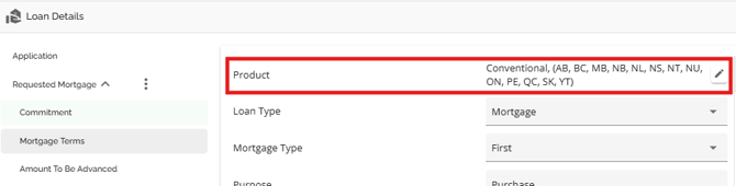 The same functionality exists in both sections (Requested Mortgage and Mortgage Terms), i.e. If your company has set up a product matrix in the Manager Portal, you have the option to choose from a list of eligible products in this field to apply to your application. Depending on the level of configuration, when selecting your product, the rate and terms may update automatically.