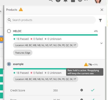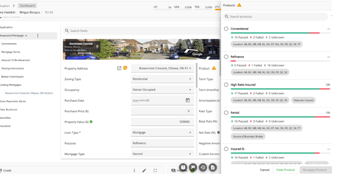 Once the Product button is clicked, a sidebar containing a list of active products will open. Each product will show the rate as set up in the Manager Portal, and it will have a coloured bar to provide a visual indication of the number of product attributes compatible with the application. This includes the number of attributes that have passed, failed or are unknown, the location (i.e. the province) the product is available in, and the features attributed to that product (Combo, Edge, Insured, Line of Credit).