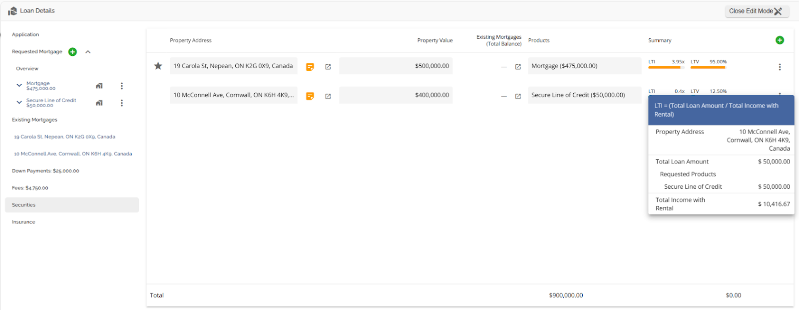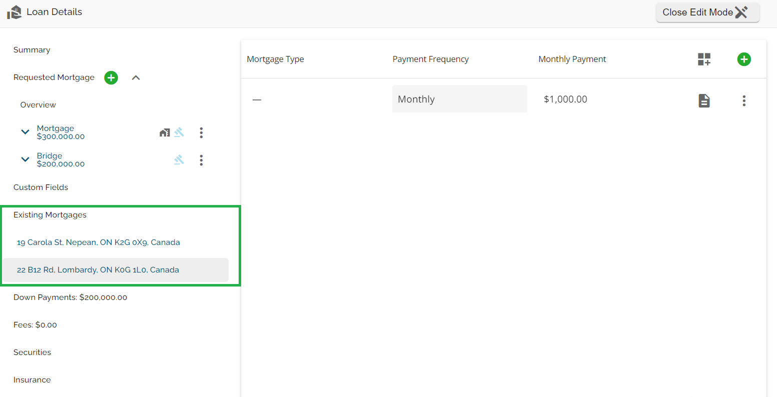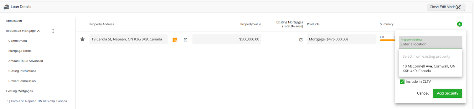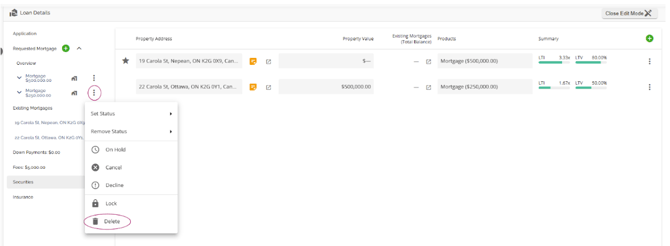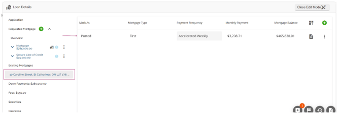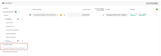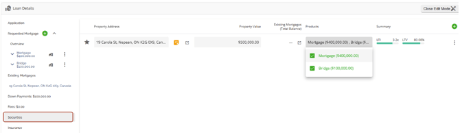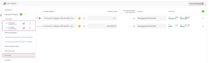 With this functionality, the subject property will automatically populate in both the Security and Existing Mortgages tabs. When additional properties are added as additional securities, they will also populate within both tabs. The properties within the Existing Mortgages tab will also populate in the list within the left sidebar.