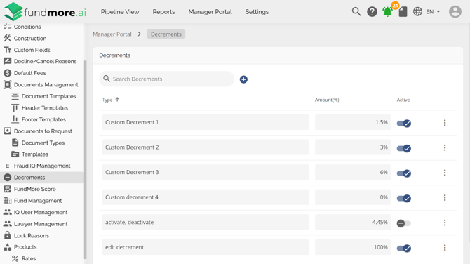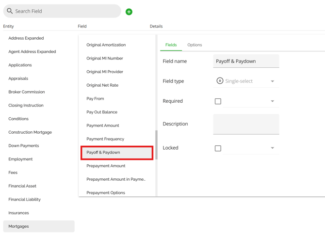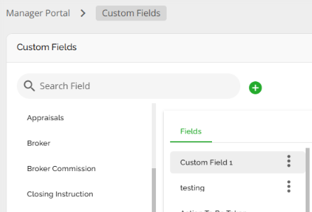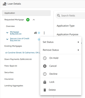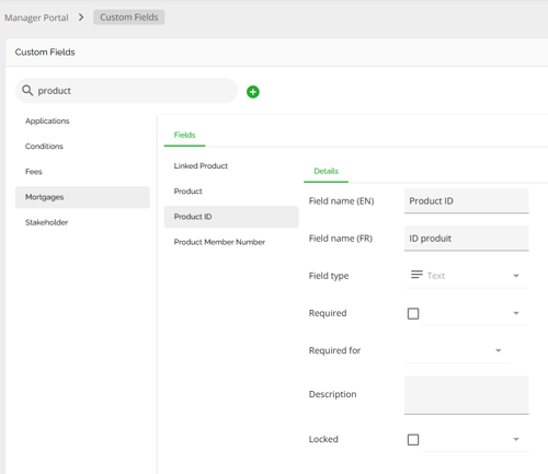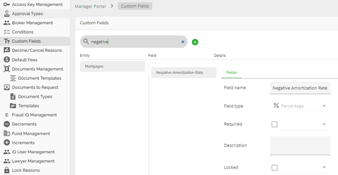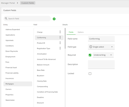 The mortgage entity is one of the few places in the application Lenders can configure Custom Fields. These are configured via Custom Fields in the Manager Portal. Custom fields added in the mortgage entity in the Manager Portal will be identified by an ellipsis to the right as seen below.