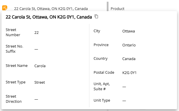 The orange note icon located to the right of the address field opens a pop up screen that displays the address broken out into individual fields. When you are in the 'Loan Details' widget's edit mode, clicking on the orange icon will open a pop-up window containing an editable version of the Address Details. This feature allows you to edit specific fields without having to retype the entire address. After making your changes, click the 'Save' button in the bottom left corner to save and close the window, or you can choose to cancel if needed.