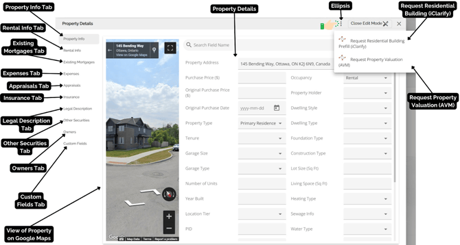 In addition to viewing property information, you can also request a Property Valuation using 'Verisk' or verify and update property details using the 'iClarify Request Residential Building' information. To access the AVM or Building info, simply click on the ellipsis located in the top right-hand corner. For more detailed information on the functionality of this section, please refer to our Property Details Pop Up Product Feature Guide.