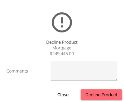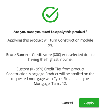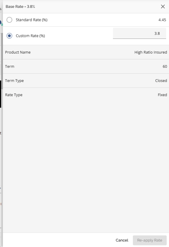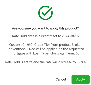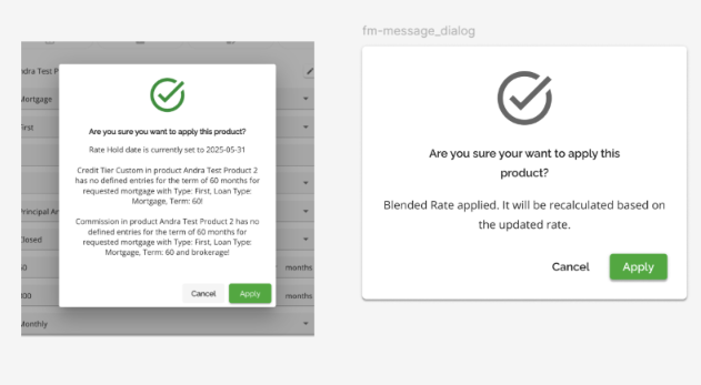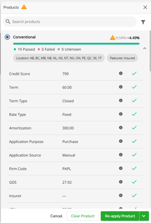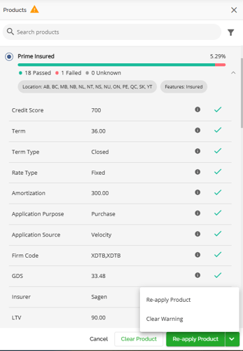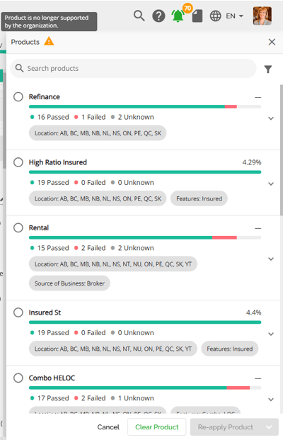 They can choose to cancel, clear the product, reapply the product, or clear the warning. By choosing to cancel the flag and the product will remain however the flag will not interfere with workflow. Selecting Clear will clear the product application, the warning symbol disappears and there is no product applied. Selecting Re-apply Product enables them to select the same product or another one, updating the rates and terms for their selection. Users will get this confirmation pop up. If they want to proceed when selecting Re-apply Product. By doing so, the application will be updated with the updated terms and the warning will disappear.
