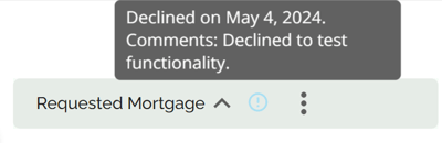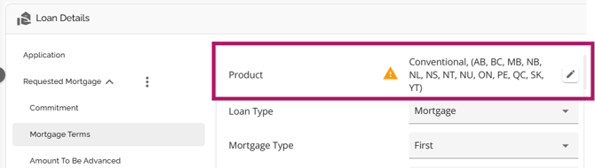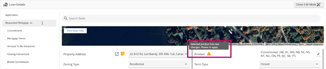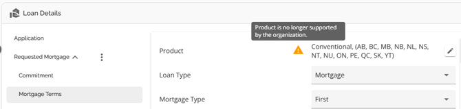 If products are updated in the Manager Portal, the system will apply a warning flag beside the product in Requested Mortgage and Mortgage Terms indicating there has been a change in the product.