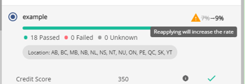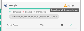 Each product can be expanded by clicking on the downward facing arrow to the right of the product tile. Expanding the product will display all the attributes and default values applied to that product, what the corresponding value within the application is to that attribute and default value, a tooltip which when hovered over displays the attribute and default value requirement for that product, and an indication if that attribute and default value was a pass or fail. A pass means the value in the application met the product requirements. A fail means the value did not meet the product requirements, and an unknown means there is a missing value in the application so the system could not evaluate it.