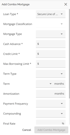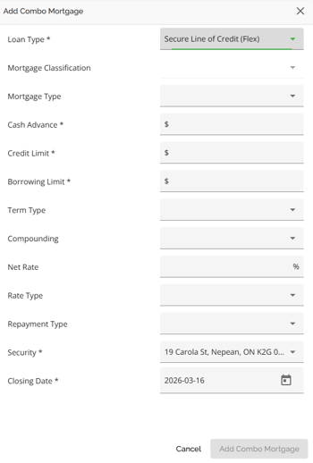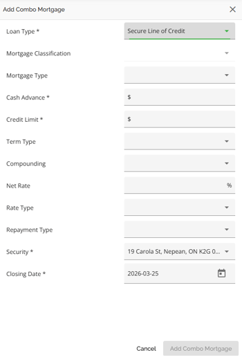 The Securities tab is used to identify which property or properties (blanket or multi product applications) is being used as security for the mortgage. If the applicants have additional properties that they want to use as security for the mortgage, excluding the subject property, those properties can be added in this section. The subject property will populate this section by default. All properties owned should already be listed in the Net Worth Widget. If a blanket mortgage is being considered you will see at the top of this tab two LTV calculations (LTV & CLTV). The CLTV calculation considers all properties and their associated mortgages, allowing the lender to accurately assess the impact of using additional security. The ability to transact blanket mortgages is controlled by a tenant setting.