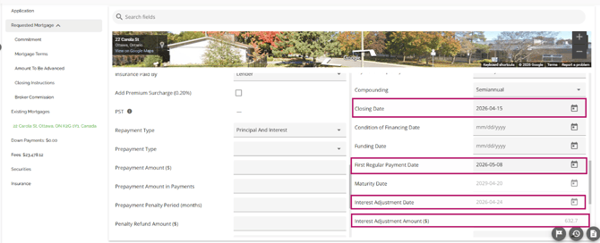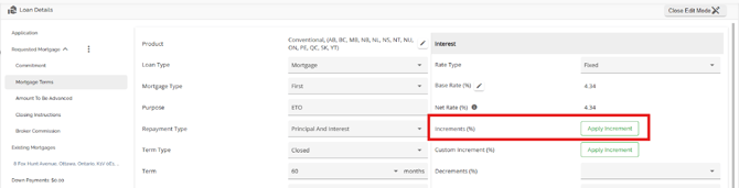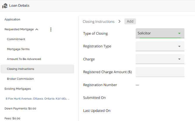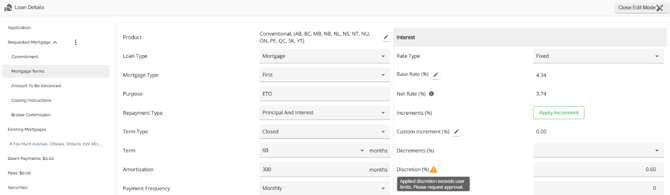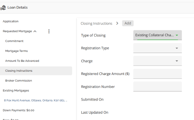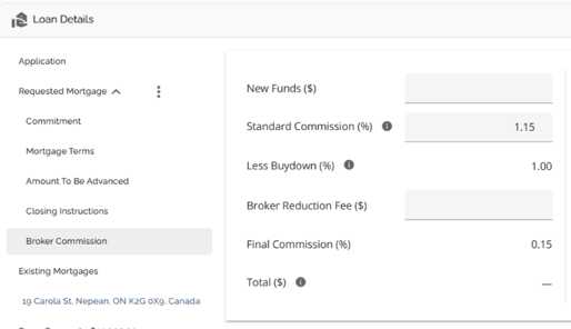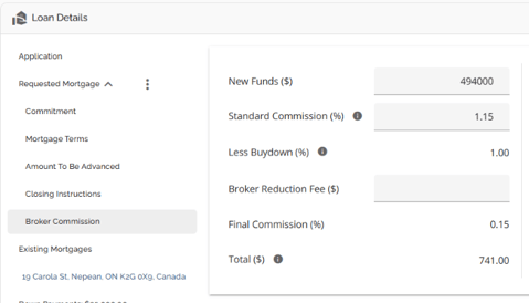 The requested mortgage tab houses information about the mortgage being applied for. This information consists of the mortgage terms, applicable dates (Closing Date, First Regular Payment Date, Maturity Date, & Interest Adjustment Date), and product information. The requested mortgage tab is further segmented into sub tabs consisting of Commitment, Mortgage Terms, Amount To Be Advanced, Closing Instructions, and Broker Commission. These sub tabs break down the data in the Requested Mortgage tab. To show or hide the housed tabs, simply hover to the right of the Requested Mortgage tab until an arrow appears. Click on the arrow to hide the tabs when it is pointing up, or to view the tabs when it is pointing down.