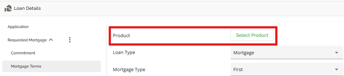 Product can be applied in either the Requested Mortgage Tab or the Mortgage Terms Tab.