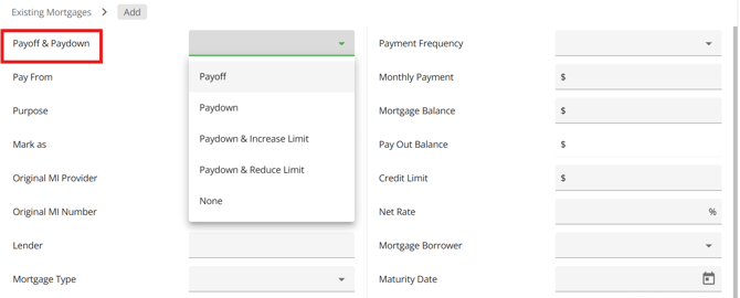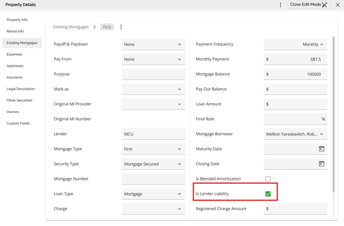 Users can now mark existing Lender mortgages in the Existing Mortgages tab to ensure they are included in all mortgage aggregates (current and future) by checking off the Is Lender Liability checkbox. This ensures current aggregates also update when the "Is Lender Liability" checkbox is ticked.