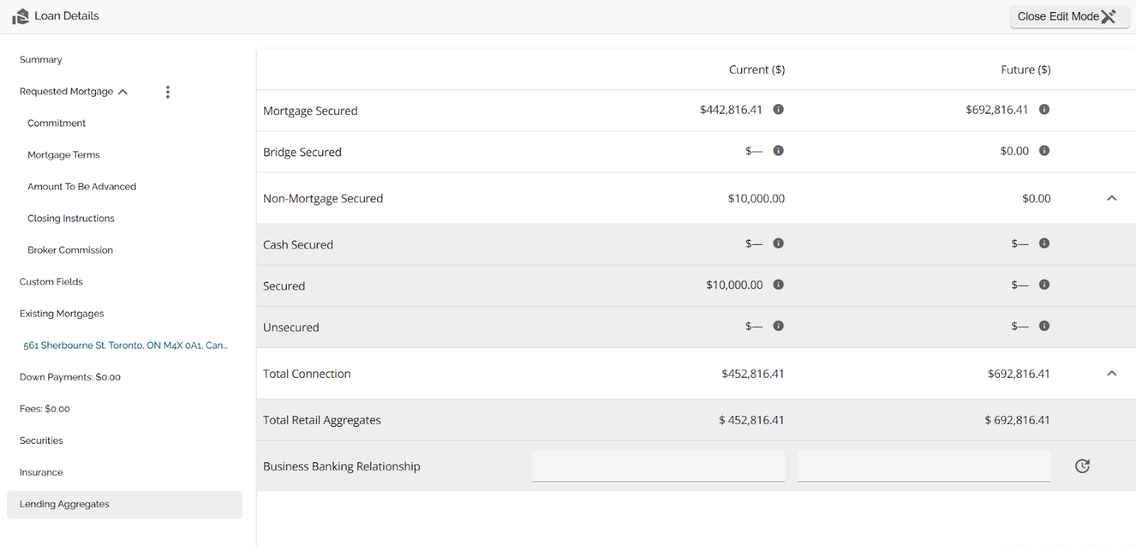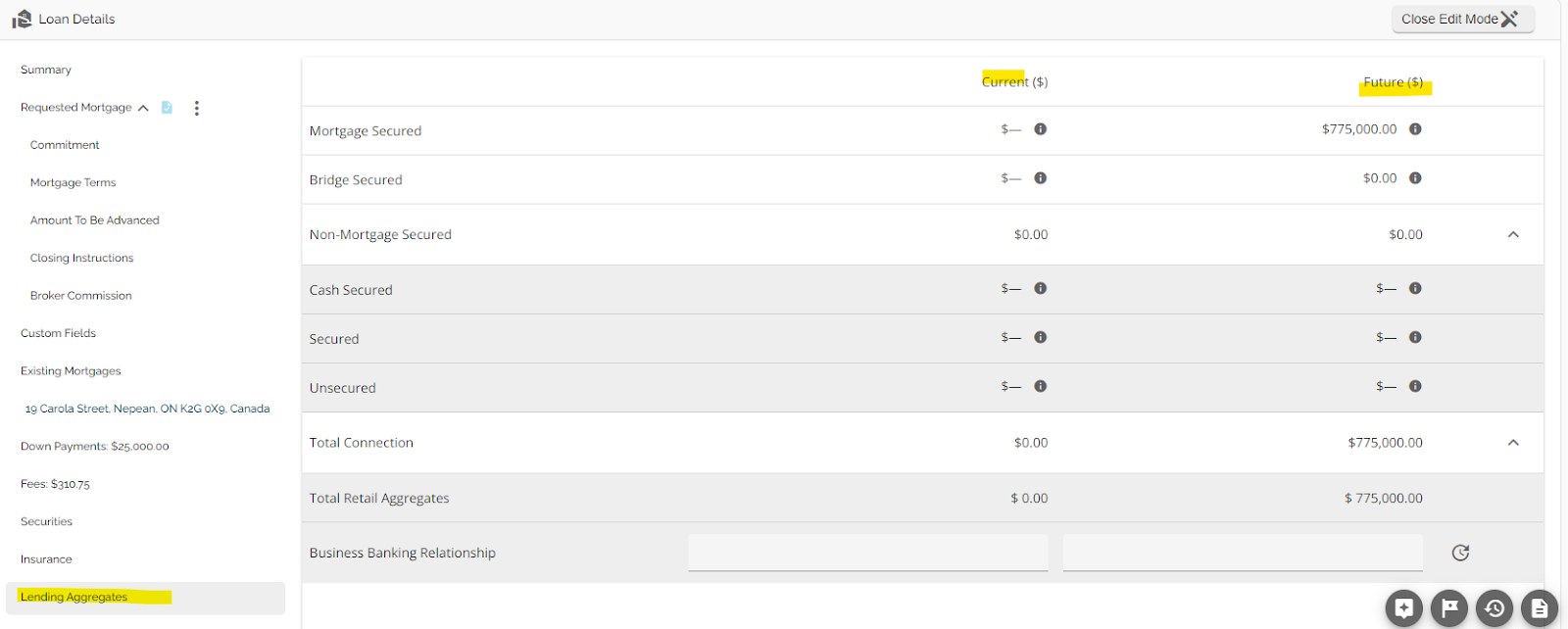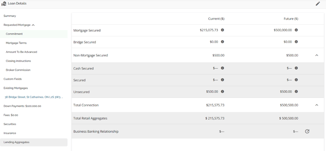 We have implemented the Lending Aggregates tab which displays and calculates all aggregates by security type including Retail and Business Banking connection. The Lending Aggregates tab is located in the Loan Details widget as per the screenshot below.