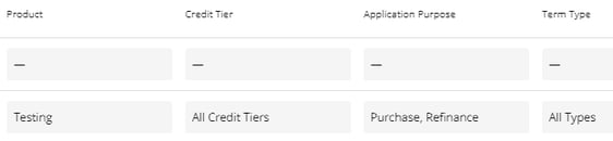 These criteria must be set up in default fees for them to apply accordingly. In the screenshot below, the line that has dashes in the criteria section means that no criteria were selected or null. The system will ignore these fields when matching to the application. You also see that All Credit Tiers and All Types are also selected for Credit Tier and Term Type for the 2nd fee. In this case the system will look to match at least one of the values for those categories to the application. If none are found, the fee will not match and therefore not be applied.