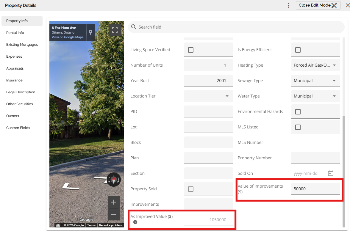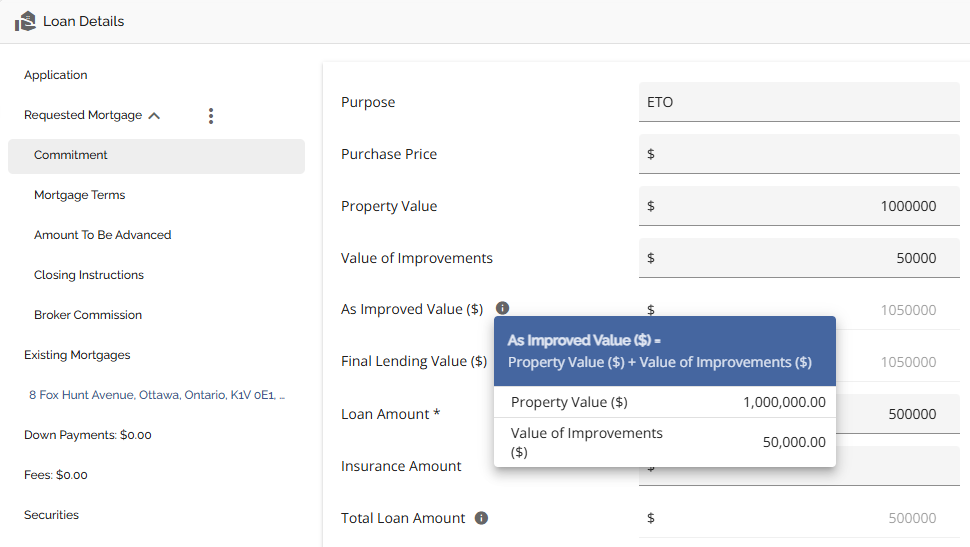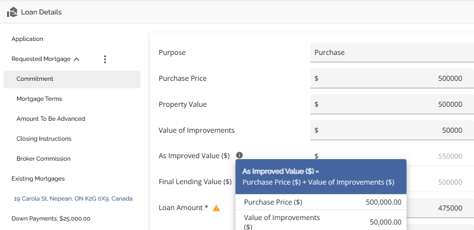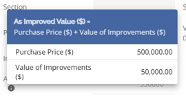 In the ‘Value of Improvements’ field users can indicate the value of the improvements that are being added. The As Improved Value field will calculate and populate based on the purchase price plus the Value of Improvements that are input. There is a tooltip indicating the formula and the values used to calculate the As Improved Value.