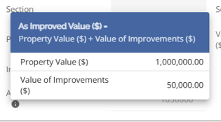 The Value of Improvements field that was previously in the Property Info tab of the Property Details Pop up remains. Both fields are synchronized and will populate as data is input into either one of them. There is now an As Improved Value added to the Property Info tab as well that is automatically calculated by data inputs with a tool tip that tells the user what the formula is to calculate the As Improved Value and the values used to calculate it.