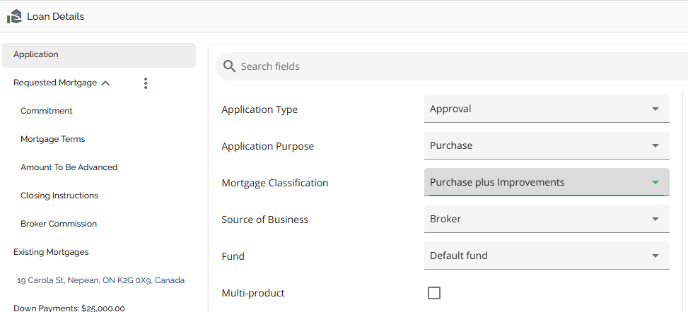 The Application tab is essentially a high level summary of the application indicating the application type, purpose, classification, source of business, fund (if applicable), whether it is a multi product or not, the Total Loan Amount, and any custom fields added to the application entity.