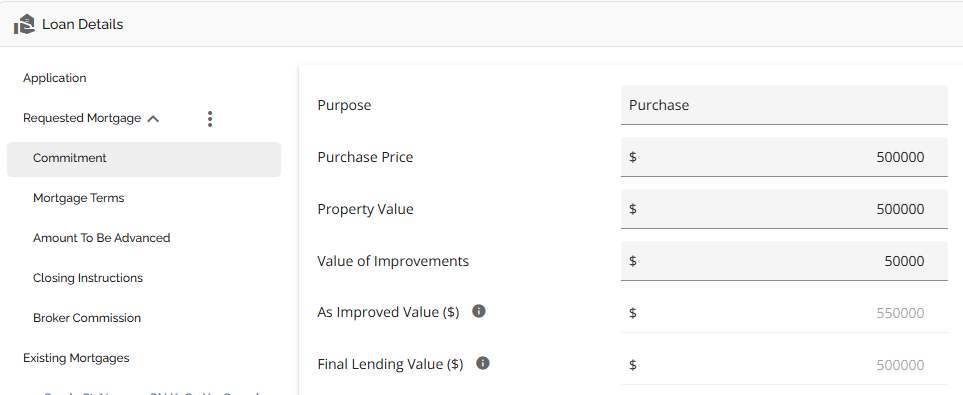If this classification is selected, there is a new ‘Value of Improvements’ field, an ‘As Improved Value’ field, and a Final Lending Value field that will appear in the in the right hand pane of the Commitment tab where users can indicate the value of the improvements that are being added: