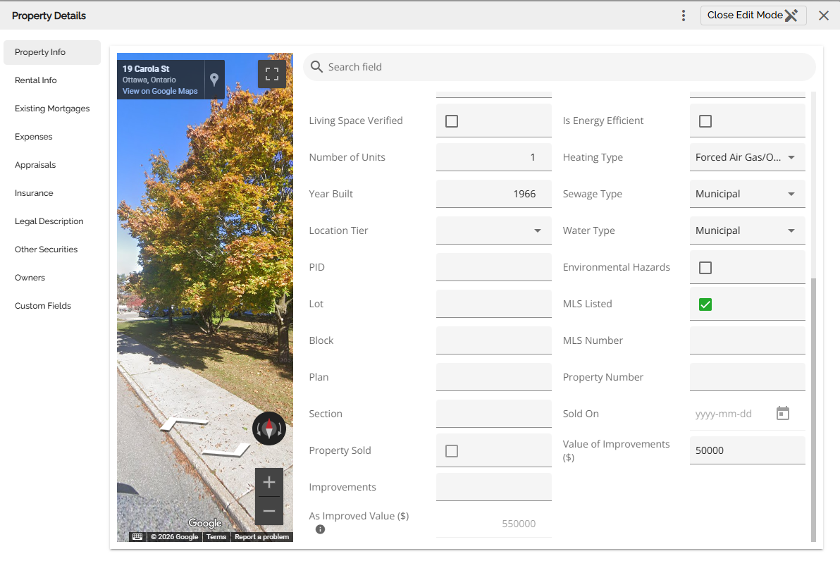 FundMore AI is integrated with Google Maps. As you begin typing an address into the system, a list of options will typically appear below, similar to what you are entering. With the integration of Google Maps, the system not only pinpoints the address but also provides a Google Street view of the property's location in the Property Details pop-up. If Google Street view is not available for the property, the map will default to Google Satellite view.