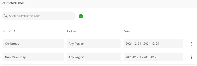 Add New Restricted Dates Button - This is used to add new restricted dates. When selecting this button a pop up will appear with fields to input data. The fields consist of: Name*, Region* and Dates.
