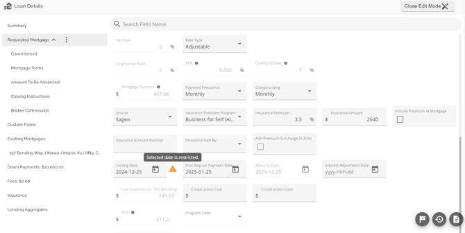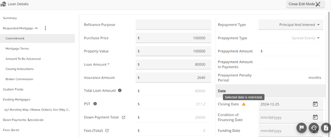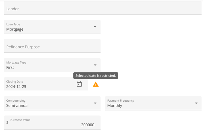When a user selects a Closing Date that falls on a restricted date, the system will automatically display a warning to prompt the user to take action. Hovering over the warning icon reveals a tooltip message, clearly informing the user of the restriction. This allows users to take note of the conflict and make any necessary adjustments to the Closing Date.