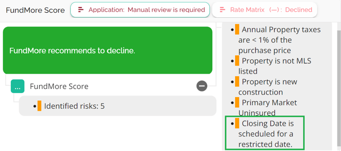 - FundMore Score Widget: If this setting is enabled, a risk warning will appear in the FundMore Score widget if a closing date is set to a restricted date in the Manager Portal. Users can remove the risk warning by updating the closing date to a non-restricted date.updating the closing date to a date that is not restricted.