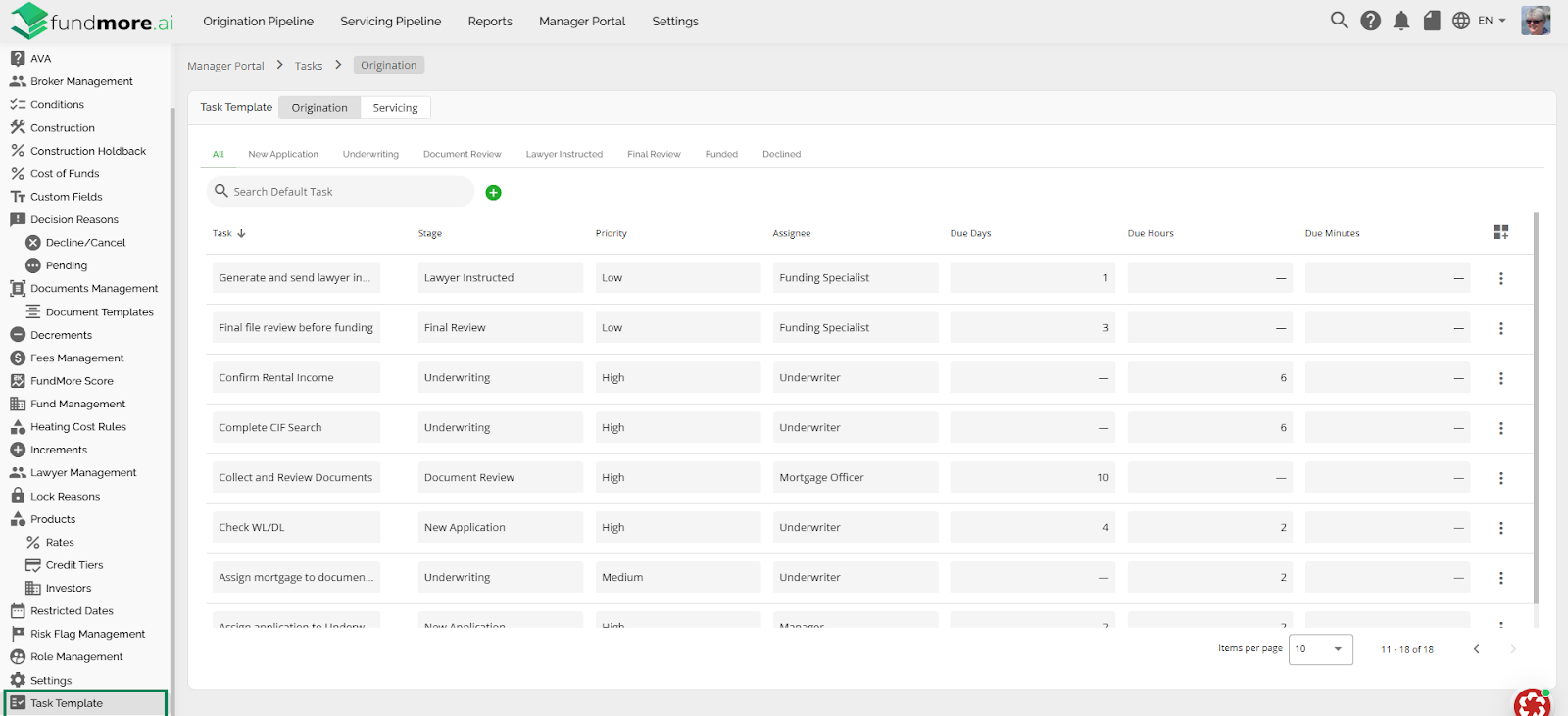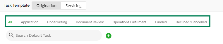 If you have a Servicing module then you can set up tasks specific to Servicing by selecting the Servicing tab to the right of the Origination tab. The functionality between the two is exactly the same.
