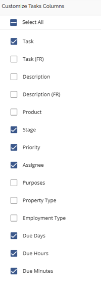 ‘Add New Task’ Button - Enables you to create a new task. When selecting this button a pop up will appear with fields to input data. The fields consist of: Task, Task (FR), Description, Description (FR), Application Stage, Product, Priority, Purpose, Property, Assignee, Employment, Due Days, Due Hours, & Due Minutes. These fields line up with all the possible column headers if you have all enabled in your Customized Table.