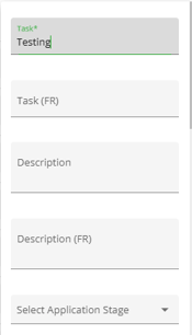 Stage - This is the application stage for which the task needs to be completed. Single select field. You also have the option to select (-) which means any or null. Selecting this option is telling the system to not evaluate or ignore this field when matching to the application